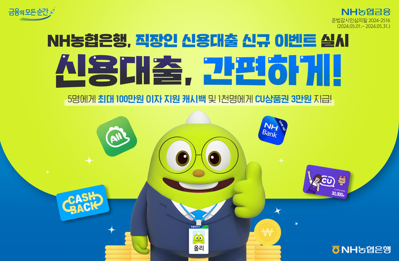 이번 이벤트는 기간 중 '비대면 직장인 신용대출 4종'을 신규 가입한 고객을 대상으로 5명을 추첨해 100/70/50/30/20만원을 캐시백한다. 추가로 신규가입고객 선착순 1천명에 CU 3만원 모바일쿠폰을 제공한다.