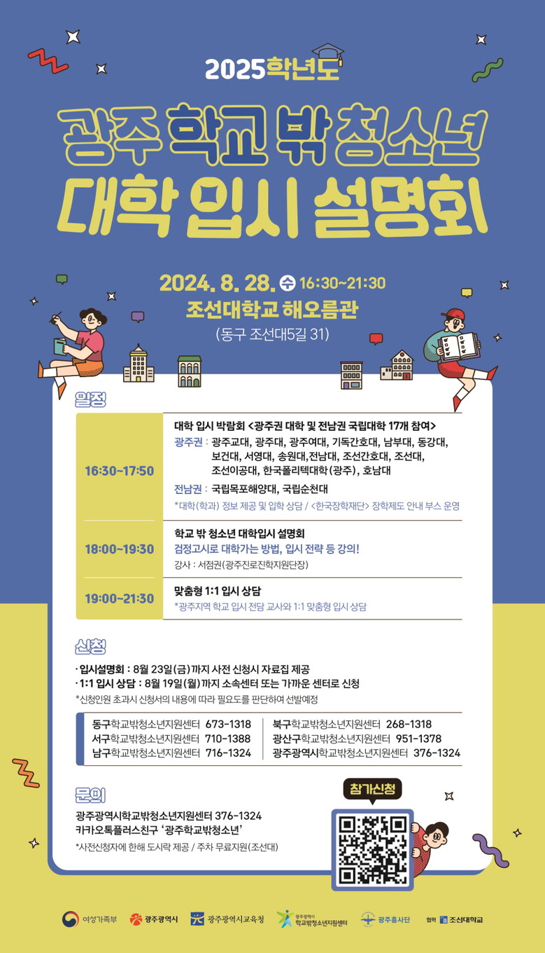 - 광주·전남지역 17개 대학‧한국장학재단 참여 역대 최대 규모 [광주 세계타임즈=손권일 기자] 광주광역시(시장 강기정)는 광주시학교밖청소년지원센터, 광주시교육청과 함께 오는 28일 조선대학교 해오름관에서 ‘학교밖 청소년 대학입시설명회’를 개최한다.