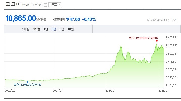 이 같은 조치는 역대 최고치를 경신한 코코아를 비롯해 유지, 원유 등 각종 원재료비와 물류비, 인건비, 전기료 등 가공비 상승이 지속됨에 따라 원가부담이 감내할 수 있는 수준을 넘어섰다는 판단에 따른 것이다. 초콜릿의 주 원료인 코코아(카카오 열매를 가공한 것)는 시세가 폭등한 뒤 좀처럼 안정세를 찾지 못하고 있다. 지난 12월 20일 코코아 선물가격은 톤(t)당 12,565달러(ICE 선물거래소)를 기록해 역대 최고치를 다시 한번 경신했다. 코코아는 지난 수십 년간 t당 2,000달러대의 시세를 안정적으로 유지해왔는데, 5~6배 수준으로 가격이 뛴 것이다. 지난 한 해 동안만 살펴봐도 172% 상승해 작년 원자재 중 최고 상승률을 기록했다.