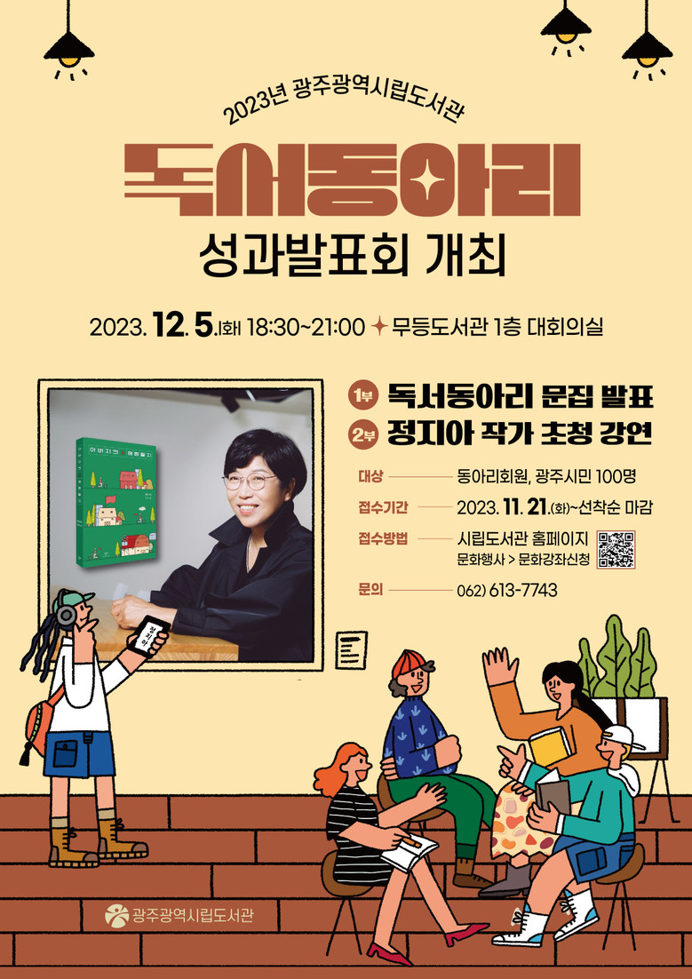 - ‘아버지의 해방일지’ 저자 정지아 작가 글쓰기 특강도 [광주 세계타임즈=손권일 기자] 광주광역시립도서관(무등·사직·산수)은 오는 12월5일 오후 6시 30분 무등도서관 1층 대회의실에서 ‘독서동아리 성과발표회’를 개최한다.