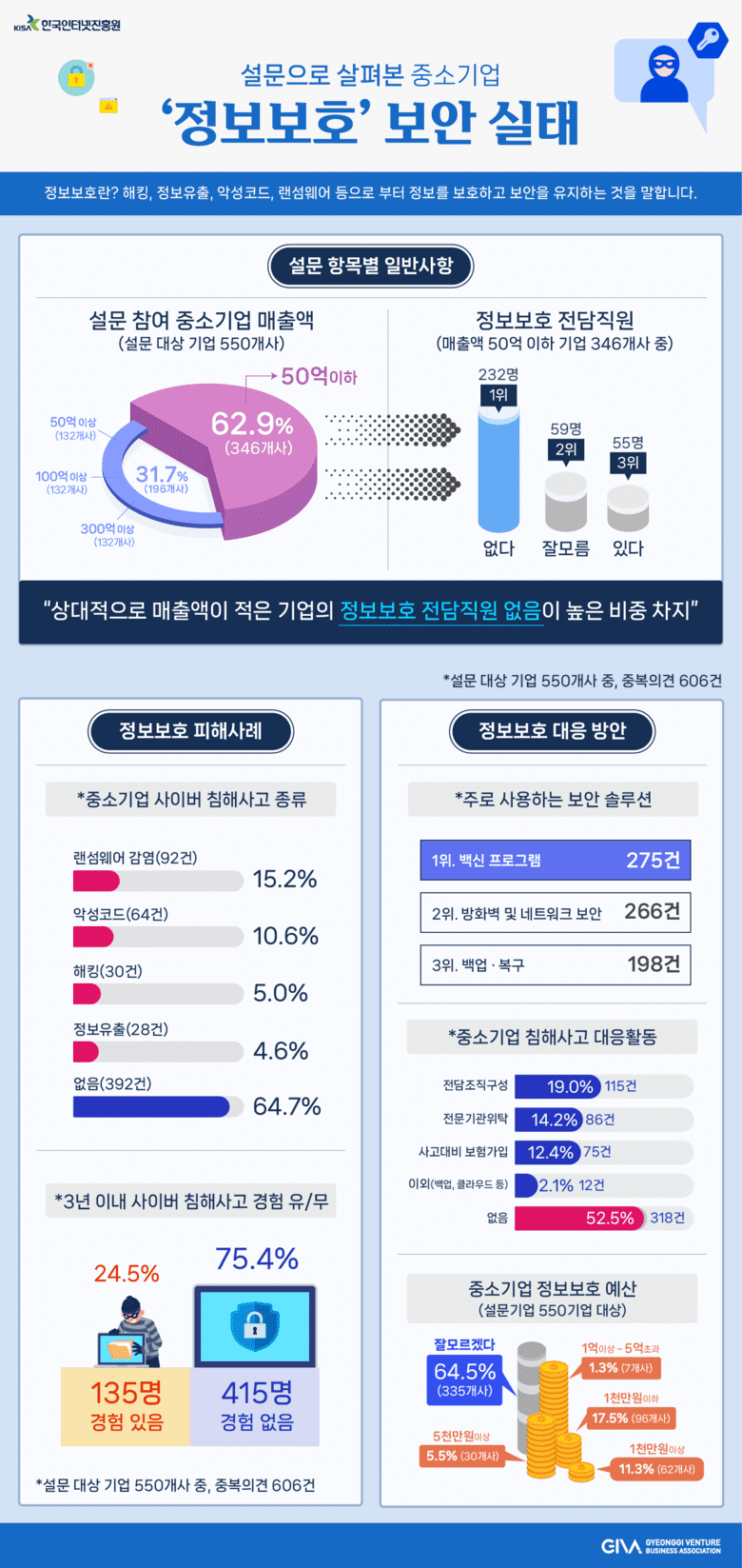 [세계타임즈 백진욱 기자] 한국인터넷진흥원(KISA, 원장 이원태)은 경기벤처기업협회(회장 서기만)와 함께 경기지역의 중소·벤처 기업의 정보보호 수요 및 실태를 분석한 ‘2023년 경기지역 중소기업 정보보호 보안실태 조사’ 결과를 2023. 8. 8.(화) 발표했다.