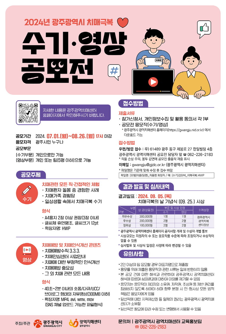 공모전 접수는 오는 8월 26일까지 이메일이나 우편, 방문을 통해 제출하면 된다. 자세한 사항은 광주시광역치매센터 누리집(https://gwangju.nid.or.kr) 공지사항을 참고하면 된다.