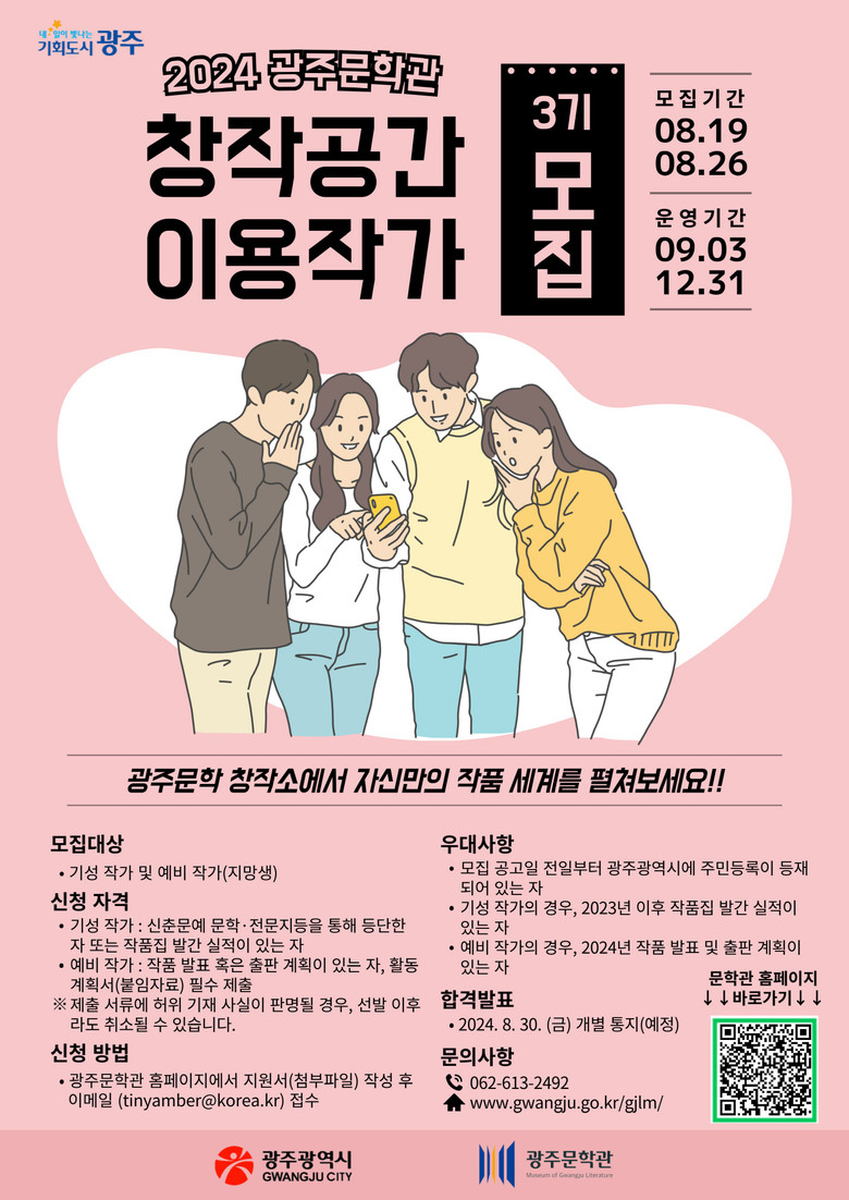 작가별로 전용 좌석을 배정하며, 공간 이용은 무료다. 교통비·식비·체재비 등은 본인 부담이다. 노트북은 개인용을 사용해야 한다. 보다 자세한 사항은 광주문학관 누리집(www.gwangju.go.kr/gjlm)에서 확인할 수 있다.