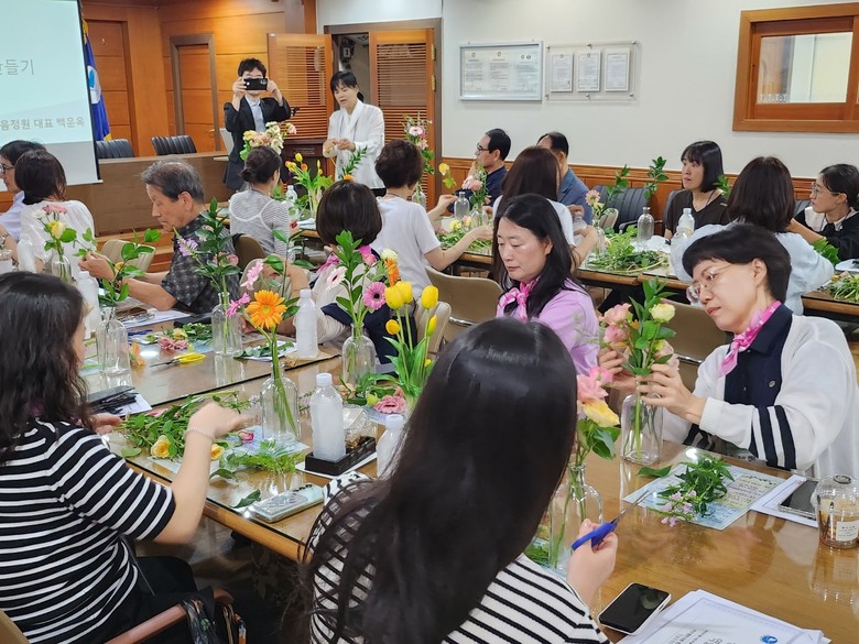 이어진 ‘미니 꽃병 만들기-마음 한다발’프로그램은 감정 노동에 지친 직원들의 마음에 맑은 한 줄기 빛을 선사하는 시간으로 마산센터 현장지원분과 위원이자 마음정원 힐링원예치료센터장이신 백운옥 대표의 후원과 지도 아래,각자 개성 있는 꽃병을 만들며 정서적 안정과 치유의 시간을 가졌다.