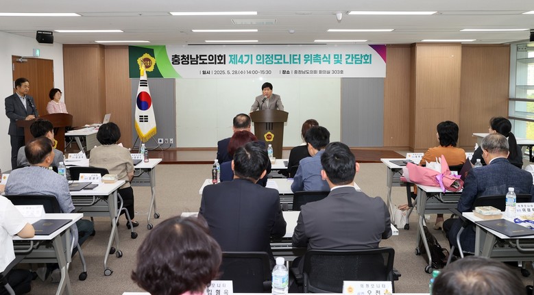 충남도의회(의장 홍성현)는 28일 의회 회의실에서 ‘충청남도의회 제4기 의정모니터’ 위촉식 및 간담회를 개최했다.