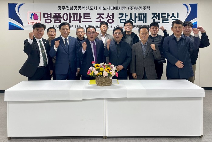 [세계타임즈 이진화 기자]전라남도 나주시 빛가람동에 위치한 광주전남혁신 이노시티 애시앙 아파트 입주자대표회의는 1일 아파트 단지 내 관리사무소에서 아파트 시공사인 부영주택에 감사패를 전달했다.