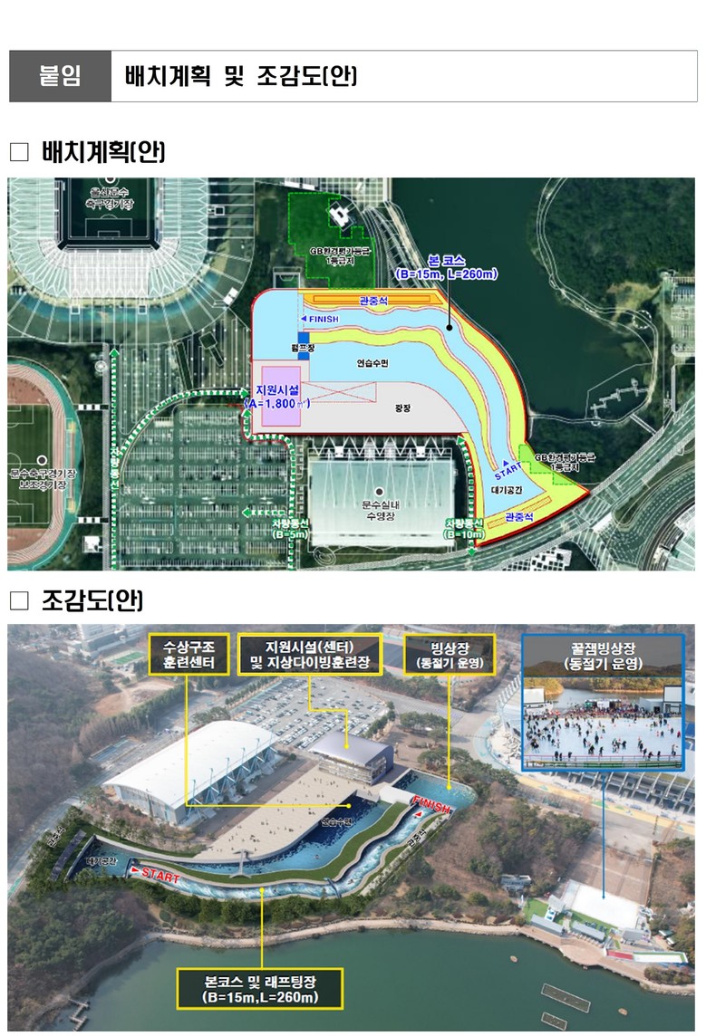 특히 경기장은 도심지 내 입지하여 ▲급류타기(래프팅) ▲수상구조훈련센터 ▲빙상장 ▲야외수영장 ▲실내카누연습장 등도 마련돼 다양한 스포츠활동 기회를 제공할 예정이다.