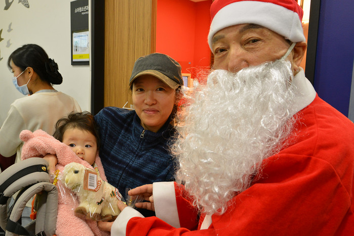 | ▲ 19일 산타할아버지가 된 H+양지병원 김철수 이사장이 병원 소아청소년과에서 한 어린이에게 X-마스 선물을 주며 즐거운 시간을 함께 나누고 있다. |