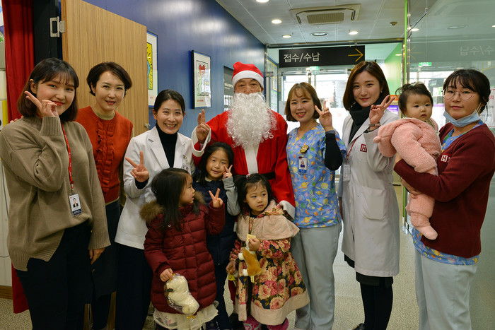 | ▲19일 산타할아버지가 된 H+양지병원 김철수 이사장과 소아청소년과 의료진, 환자경험관리실 직원들이 어린이들에게 쿠키와 인형 등 X-마스 선물을 나눠주며 즐거운 시간을 보냈다. |
