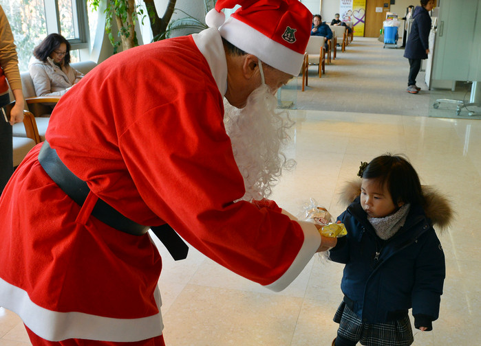19일 서울 관악구 소재 종합병원, 에이치플러스 양지병원이 개최한 ‘해피크리스마스 축제’에서 이 병원 김철수 이사장이 산타클로스 복장을 하고 소아병동과 소아청소년과 어린이들에게 쿠키와 인형 등 X-마스 선물을 나눠주며 따뜻한 마음을 전했다.