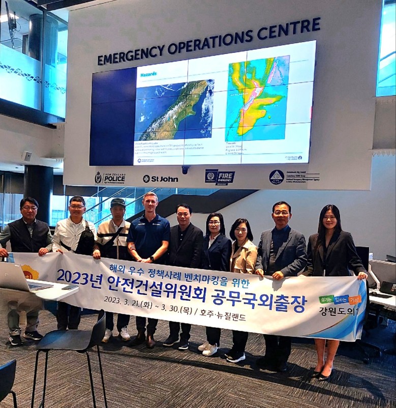 강원도의회 안전건설위원회(위원장 박기영 국힘(춘천3))는 24일 뉴잴랜드 크라이스트처치 시(市) 재난구호과(Civil Defence Emergency)를 방문하여 재난대비 주요 정책 및 운영 체계 등을 청취하고 강원도와의 비교분석을 통해 접목방안을 연구하는 시간을 가졌다.