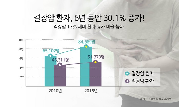 -6년 간 결장암 환자 30% 증가, 직장암 13% 대비 환자 증가 비율 높아