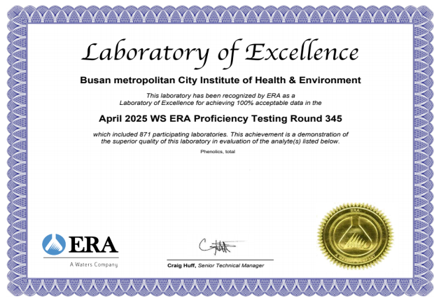 ◈ 2017년부터 9년 연속 최고 등급 유지로 세계적 수준의 분석 역량 입증해 [부산 세계타임즈=이용우 기자] 부산시 보건환경연구원(이하 연구원)은 먹는 물 분야 분석 능력 검증을 위해 참가한 미국 환경자원협회(ERA) 주관 국제숙련도 평가에서 전 항목 '만족' 판정을 받아 '최고 등급' 인증을 획득했다고 밝혔다.
