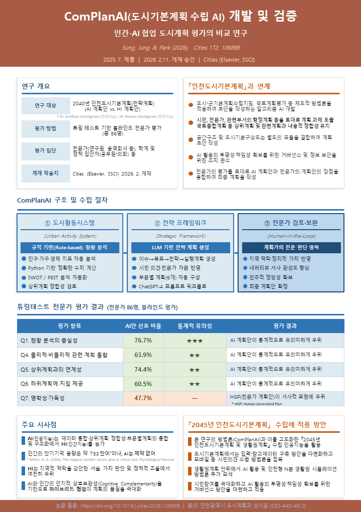 해당 방법론은 국제적으로도 이미 검증을 마쳤다. 2040년 인천도시기본계획 변경 수립 경험을 바탕으로 인공지능과 인간의 계획 특성을 비교·분석한 연구 「컴플랜에이아이를 활용한 도시계획(Planning with ComPlanAI)」은 2026년 2월 21일 사회과학인용색인(SSCI) 등재 도시계획 분야 최상위 국제학술지인 Cities(시티즈)에 게재됐다. (https://doi.org/10.1016/j.cities.2026.106898)