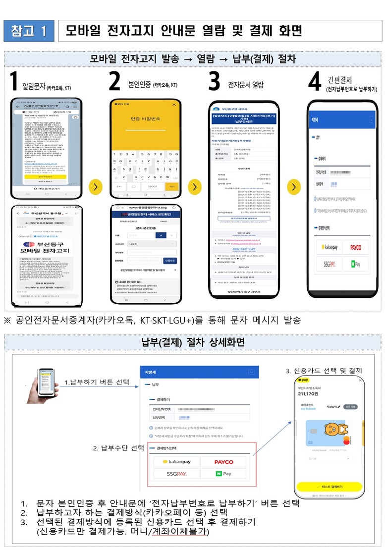 ◈ 시, 납세자 중심의 행정과 더욱 편리한 서비스를 제공하기 위해 앞으로도 지속적으로 노력할 예정 [부산 세계타임즈=이용우 기자] 부산시(시장 박형준)는 기존 우편(종이) 송달하고 있는 지방세 관련 각종 고지·안내문을 전자문서 형태로 공인전자문서중계자(카카오, KT, SKT, LGU+) 문자 메시지로 전송하는 '모바일 전자고지 서비스'를 2월부터 본격 시행한다고 밝혔다.