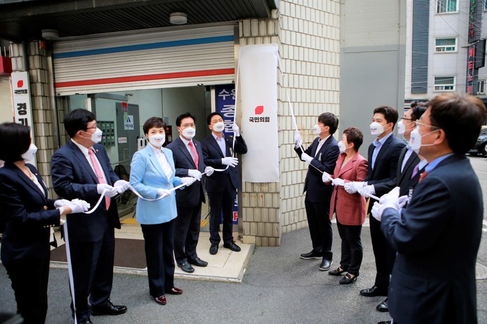 [세계타임즈 이진화 기자]14일 오전 경기도 수원시 장안구 국민의힘 경기도당에서 이준석 대표와 김기현 원내대표를 비롯한 의원들이 참석한 가운데 '이재명 판교대장동 게이트 국민제보센터' 현현판 제막식을 하고 있다.
