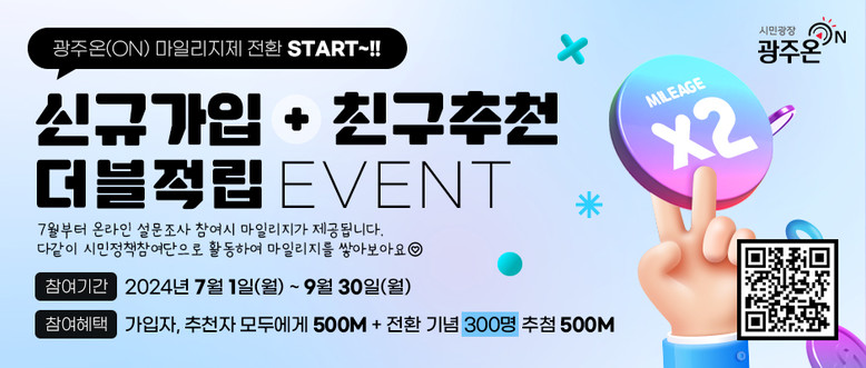 광주시는 광주온(ON) 마일리지제 도입을 기념해 ‘신규 가입’·‘친구 추천’ 더블적립 이벤트를 7월부터 9월까지 진행한다. 기존 시민 정책참여단이나 신규 가입자가 가족, 지인 등을 새로 추천하면 500마일리지를 제공하며, 매월 100명을 추첨해 500마일리지를 추가로 적립해 준다.