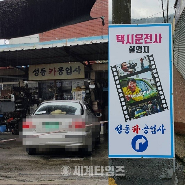 지난달 20일 한 SNS에 "순천 살다 보니 우리집 근처 이런데도 있네. #택시운전사 #택시운전사촬영지 #영화촬영지 관광지에 놀러 온 기분"이라는 글과 함께 '택시운전사 촬영지, 성동카공업사'라고 적힌 안내판과 현장이 담긴 사진이 올라왔다.