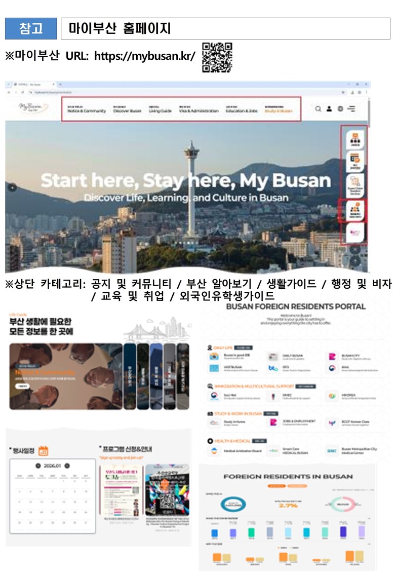 특히, 외국인 유학생의 원활한 초기 적응과 정착을 지원하기 위한 가이드인 '스터디인부산(Study in Busan)' 카테고리를 신설하여 증가하고 있는 외국인 유학생의 정책 수요에 대응하고자 하여 의미를 더했다.