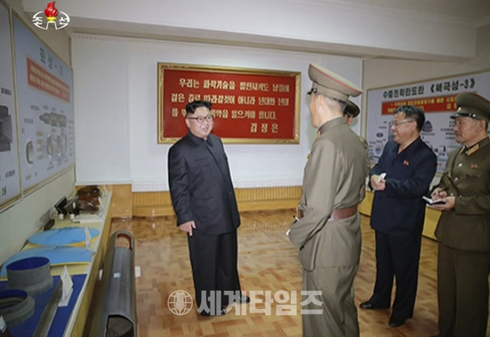 북한 최고지도자 김정은이 23일 북한국방과학연구원 화학재료연구소를 시찰하고 있다. 김정은의 뒷편 벽에 북한의 새 미사일 2종으로 보이는 미사일들의 개념도가 걸려 있다. 하나는 북극성 3호가 확실하며 다른 하나는 사진 질이 좋지 않아 식별이 어렵긴 하지만 화성 13호 또는 화성 11호인 것으로 추측된다. 북극성 3호는 이제까지 알려지지 않은 북한의 새로운 미사일이다. 이 사진은 북한조선중앙방송이 방영한 동영상을 캡처한 것이다. 2017.8.23 사진제공=뉴시스