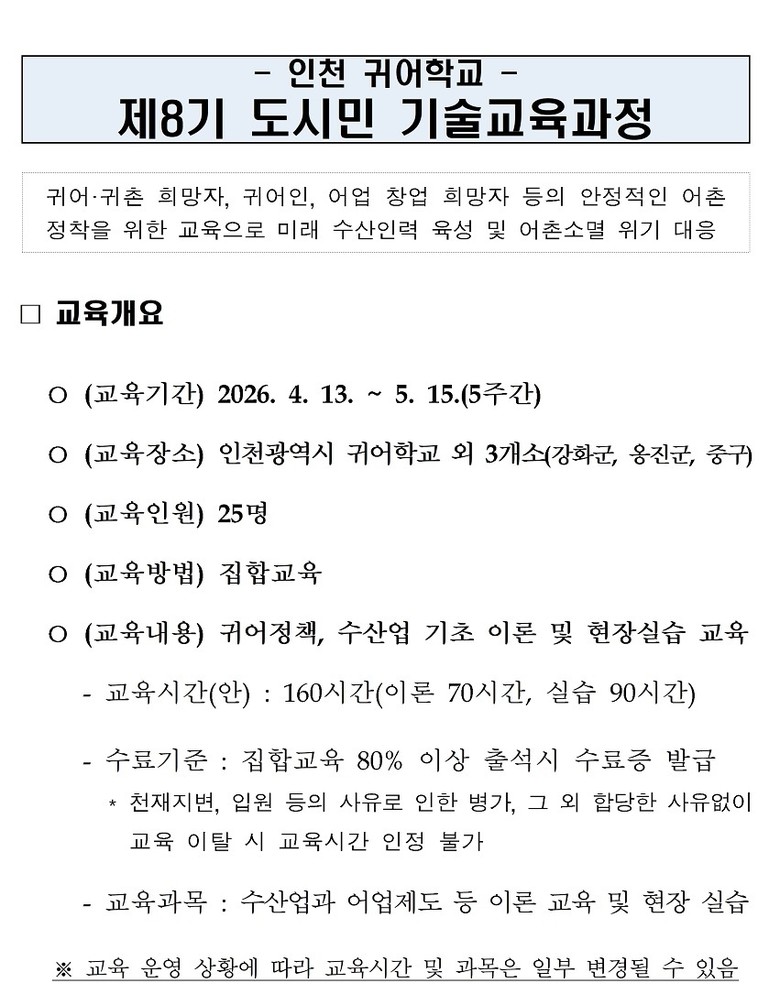[인천 세계타임즈=심하린 기자] 인천광역시(시장 유정복) 수산기술지원센터는 2월 26일부터 3월 27일까지 제8기 인천 귀어학교 입교 희망자를 모집한다고 밝혔다.