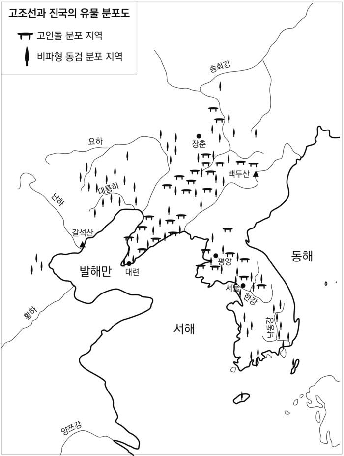 고인돌과 비파형 단검(비파형 동검)의 분포지역을 근거로 추정한 고조선과 유물지도는 [그림3-3]과 같다. 그리고 이 영역은 [그림 3-2]의 고조선과 우리가 흔히 남삼한이라고 부르는 진국의 영역과 매우 흡사하여 만주를 포함하고 한반도를 거쳐 대마도에까지 이른다는 것을 알 수 있다. 아울러 한반도 이남을 제외한 만주국의 영역을 표기한 [그림 3-1]과도 비슷한 분포를 보이는 것을 알 수 있다.