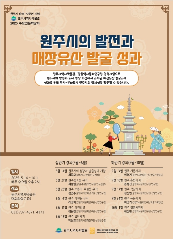 이번 강좌는 원주시 승격 70주년을 기념하여, ‘도시 성장에 따른 매장유산 발굴성과’를 주제로 총 11회에 걸쳐 상·하반기로 나누어 진행되며, 원주시민을 포함해 관심 있는 누구나 참여할 수 있다.