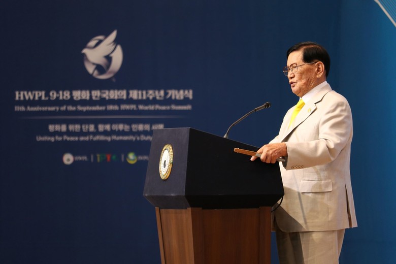 | ▲ . 18일 대한민국 청주에서 ‘HWPL 9·18 평화 만국회의 제11주년 기념식’이 열린 가운데 이만희 대표가 기념사를 하고 있다. [사진 제공=HWPL] |