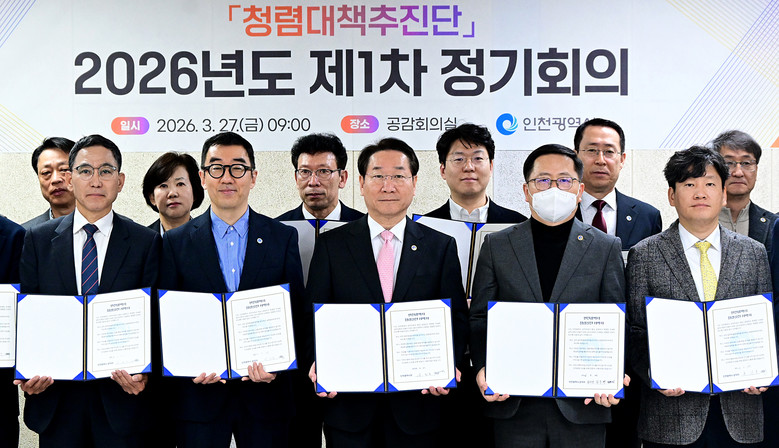 인천시는 3월 27일 시청 공감회의실에서 유정복 시장을 비롯한 3급 이상 고위직 공무원 30여 명이 참석해「2026년도 제1차 청렴대책추진단 정기회의」를 개최했다.