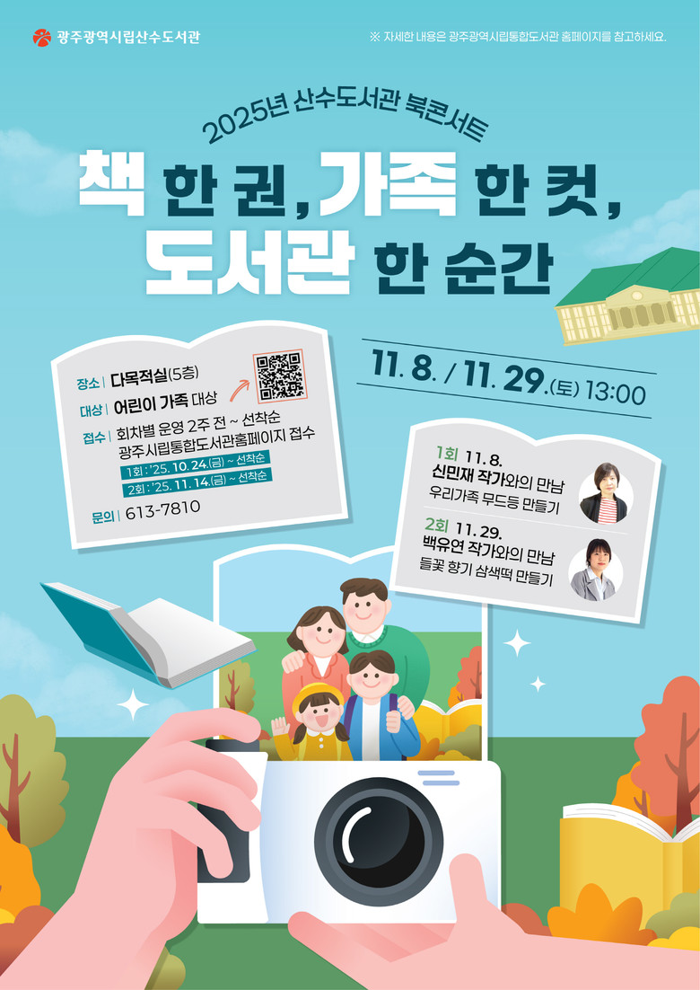 산수도서관을 이용하는 어린이 가족은 누구나 참여할 수 있으며, 참가 신청은 10월 24일부터 광주시립도서관 누리집(citylib.gwangju.go.kr)을 통해 선착순(1회차-8일 15가족, 2회차-29일 12가족) 접수한다. 자세한 사항은 누리집을 참고하거나 산수도서관(613-7810)으로 문의하면 된다.
