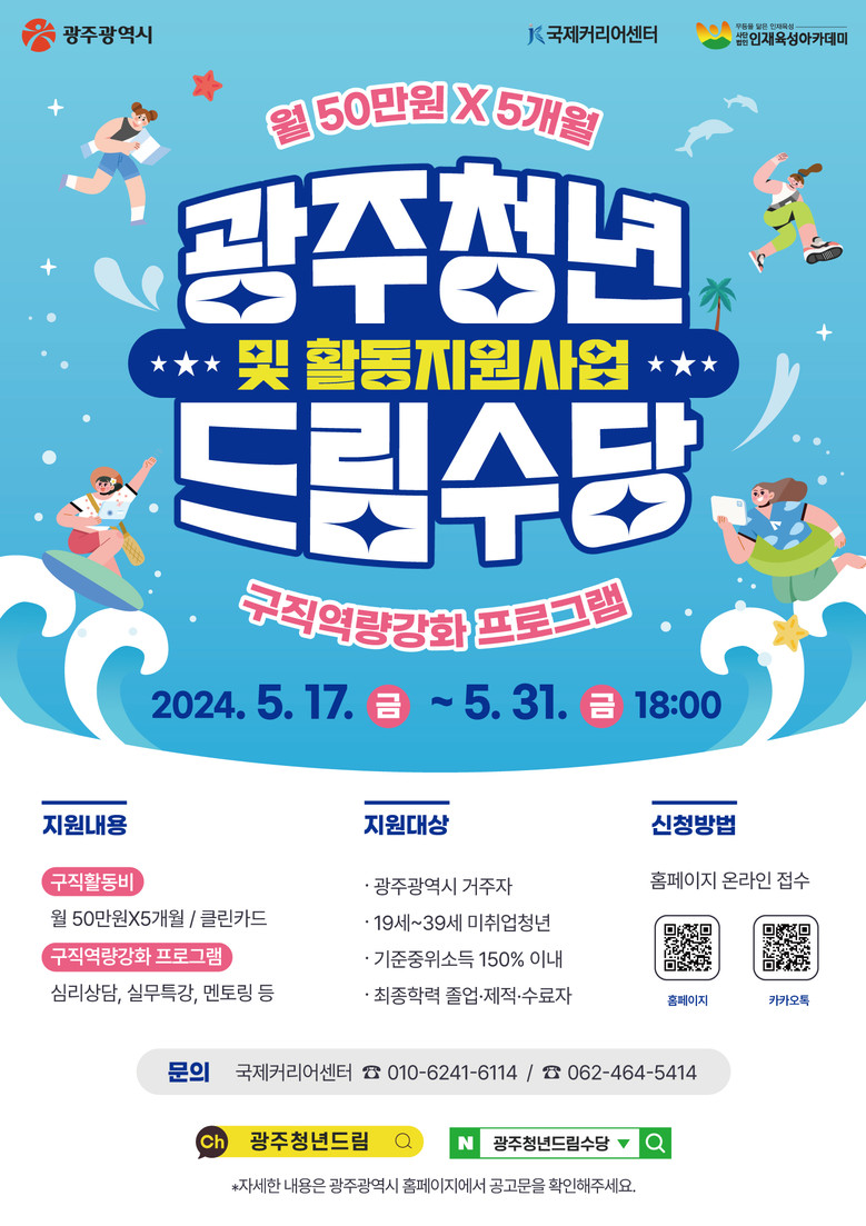 - 17∼31일 온라인 접수…구직탐색·취업준비 프로그램 지원 [광주 세계타임즈=손권일 기자] 광주광역시(시장 강기정)는 미취업 청년의 지역사회 진입을 돕고 구직활동에 필요한 경비를 지원하기 위해 ‘2024 광주청년드림수당 및 활동지원’ 2기 참여자를 오는 5월 31일까지 모집한다.
