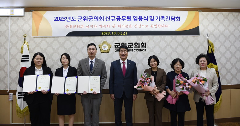 이번 임용식은 박수현 의장이 신규공무원들에게 임용장을 수여하고 자녀의 최종합격까지 응원해준 가족들에게 꽃다발을 전달하였으며, 신규공무원들이 공무원 선서를 낭독하는 순으로 진행되었다. 이어서 가족간담회를 가지며 가족들과 이야기를 나누고 군의회 본회의장, 특별위원회회의실 등을 견학하는 시간을 가졌다.