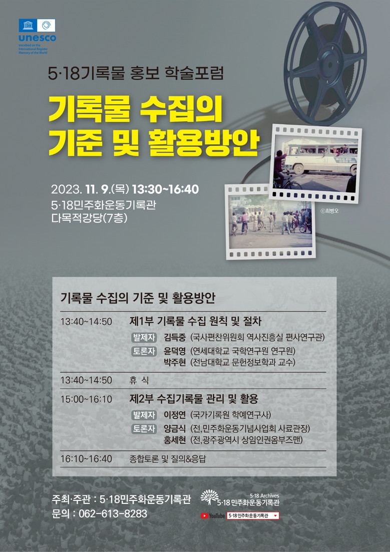 2부에서는 이정연 국가기록원 기록협력과 학예연구사가 ‘수집기록물의 관리 및 활용’을 주제로 발제하고 양금식 전 민주화운동기념사업회 사료관장, 홍세현 전 광주시 상임인권옴부즈맨이 토론을 벌일 예정이다.