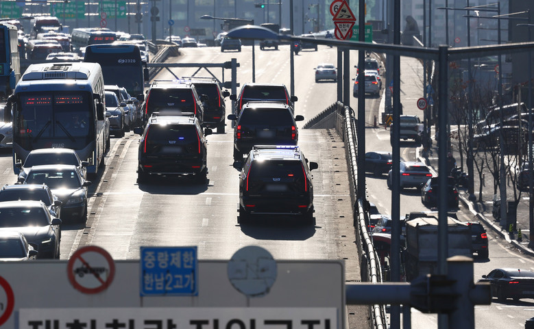 [세계타임즈 = 이채봉 기자] 윤석열 대통령이 탄 차량 행렬이 15일 서울 용산구 한남동 대통령 관저에서 과천 공수처로 향하고 있다. 2025.1.15