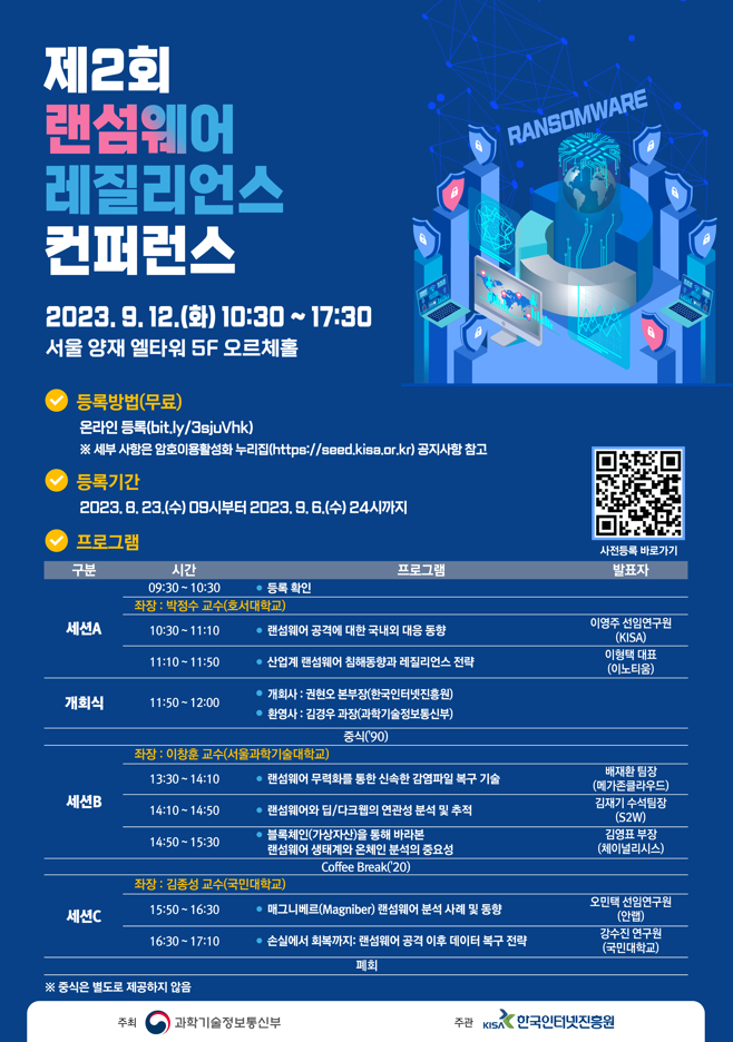 특히, 이번 컨퍼런스는 랜섬웨어 생태계에 대한 이해와 다양한 공격 대응 및 피해 복구 방법을 제공하기 위한 목적으로 개최되며, 산·학·연·관 소속 기관의 랜섬웨어 전문가들이 참여하여 대중에게 실질적으로 도움이 되는 정보를 제공할 예정이다.