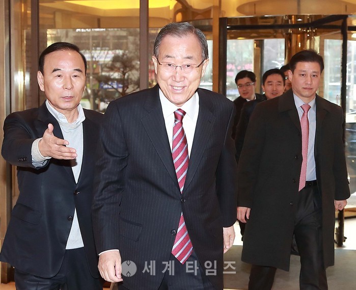 반기문 전 유엔 사무총장이 23일 오전 새누리당 초선의원들을 만나기 위해 서울 마포구 가든호텔에 도착하고 있다. 2017.01.23.