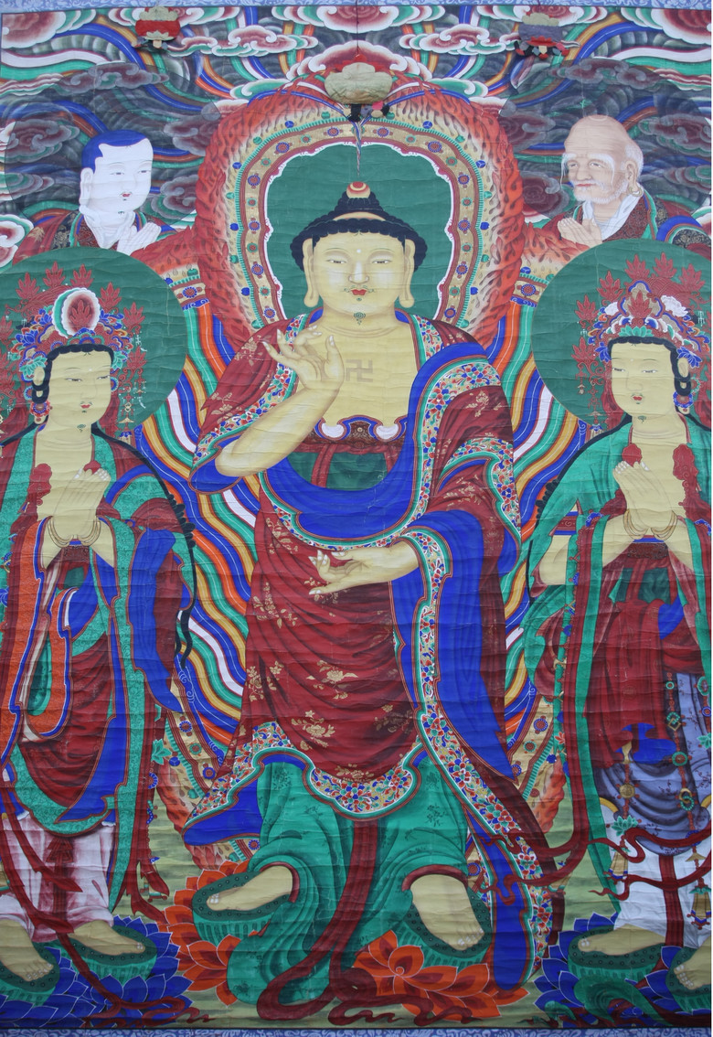 괘불도는 호국사에서 큰 법회 시 야외에 걸어서 사용하는 것으로서 화면 중앙에 부처를 중심으로 협시보살과 가섭·아난존자 등 오존(五尊)으로 간략하게 구성된 영산회상도 형식의 불화로 면포(綿布) 위에 채색하였으며 상단의 중앙과 좌우에 비단으로 만들어진 복장낭이 걸려있다.