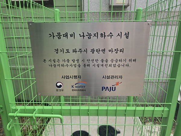 [파주시 세계타임즈=송민수 기자] 파주시는 지난 6월부터 가뭄 대비 비상 용수 확보를 위해 환경부 및 한국수자원공사와 공동으로 추진한 ‘나눔지하수사업’을 최근 완료했다고 밝혔다.