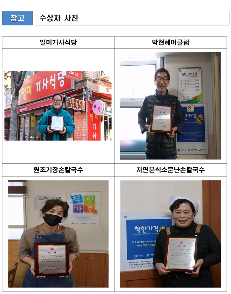 ‘착한가격업소’는 개인서비스업 중 지역 평균보다 낮은 가격으로 양질의 서비스를 제공하는 업소를 말하며, 정부와 지자체는 개인서비스요금 안정을 위해 2011년부터 지정해 오고 있다. 부산은 올해 11월 말 기준 848곳이 지정돼 있다.