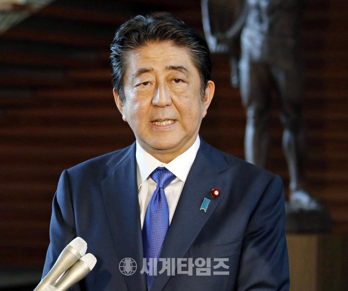 아베 신조 일본 총리가 15일 오전 도널드 트럼프 미국 대통령과 가진 전화통화에 대해 기자들에게 설명하고 있다. 2017.08.15