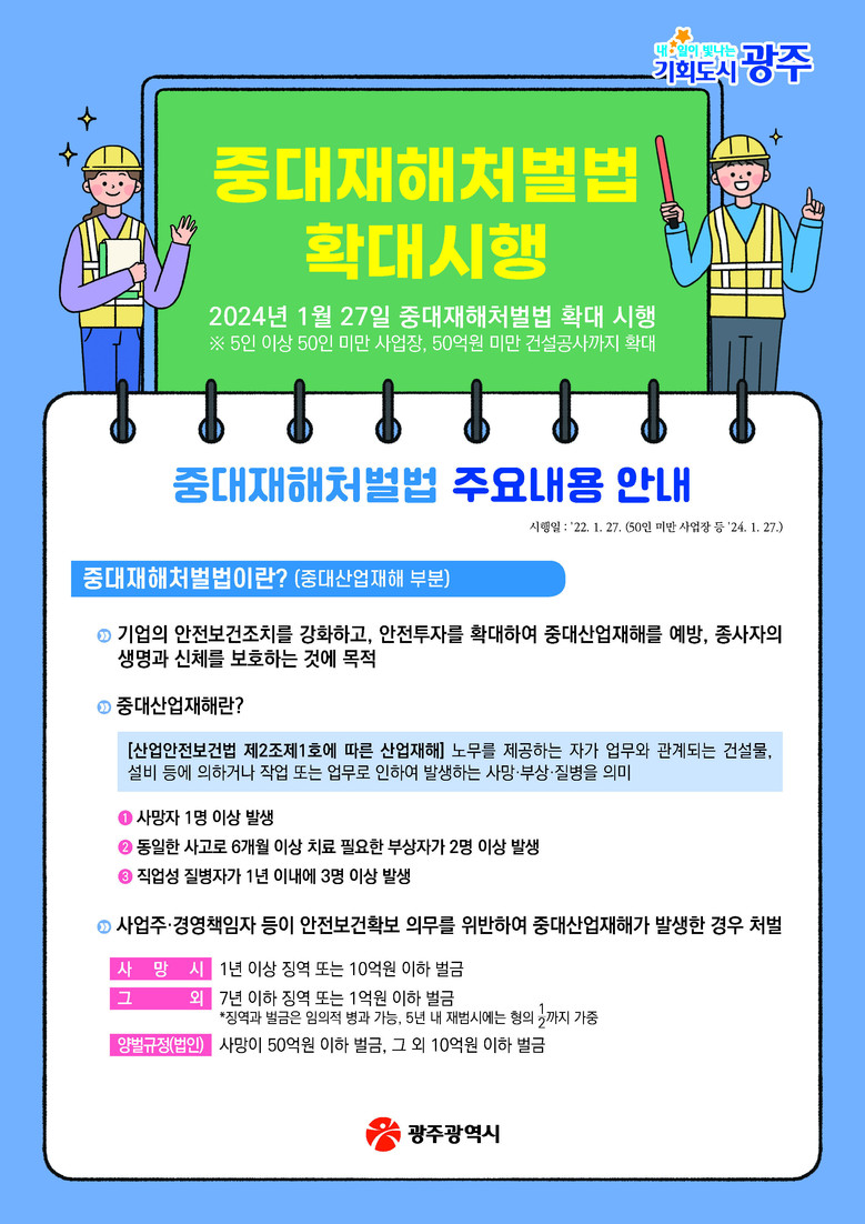 - 광주노동청·안전보건공단 협업…혼선 최소화 [광주 세계타임즈=손권일 기자] 광주광역시(시장 강기정)는 27일부터 중대재해처벌 등에 관한 법률이 상시근로자 50인 미만 사업장(5~49인)까지 확대 시행됨에 따라 관계기관과 협업해 적극 대응한다.