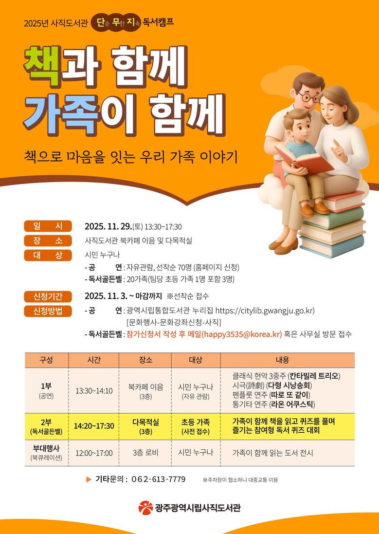 이번 행사는 ‘책과 함께, 가족이 함께–책으로 마음을 잇는 우리 가족 이야기’를 주제로, 가족 단위 독서문화 확산과 도서관 중심의 문화공동체 형성을 목표로 마련됐다. 세대가 함께 책을 읽고 이야기를 나누며, 가족 간 정서적 유대감을 쌓는 계기가 될 것으로 기대된다.