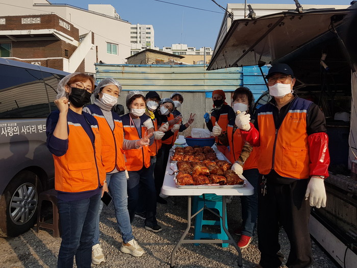 [대전=세계타임즈 이채봉 기자] 9천명 SNS 대전시 봉사단체 사랑의 사다리 밴드(리더 이정제)는 지난16일 오후3시, 코로나19 최전선에서 애쓰고 있는 대덕구보건소 100명의 직원들에게 바비큐 통닭 50마리 봉사로 우리 사회의 따뜻한 사랑을 전달 하였다.