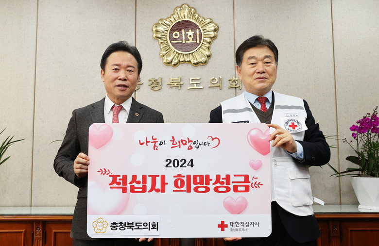 [충북 세계타임즈=이현진 기자] 충북도의회는 4일 도의회 의장실에서 황영호 의장과 장현봉 대한적십자사 충북지사 회장이 참석한 가운데 적십자 특별회비 전달식을 갖고 따뜻한 온정을 전했다.