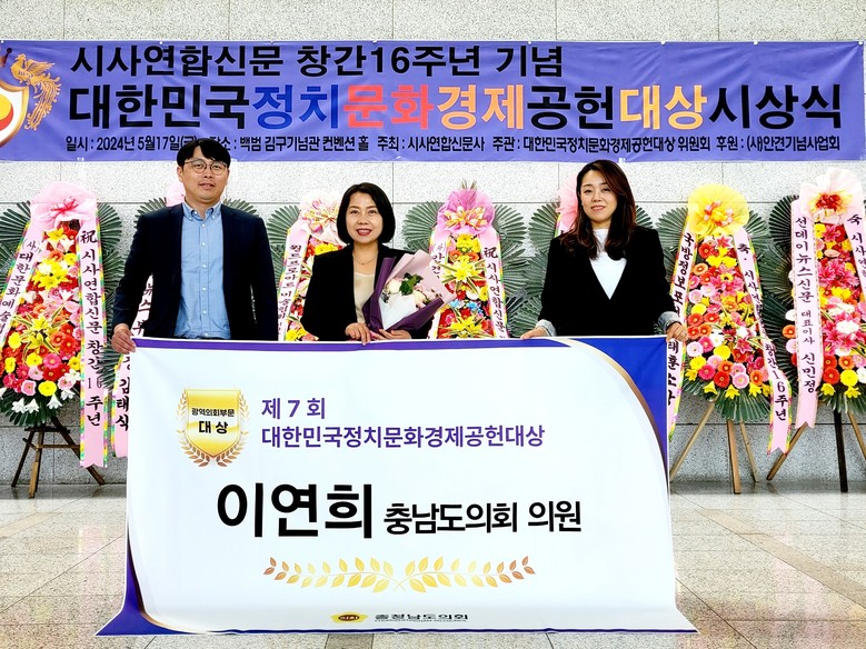 [충남 세계타임즈=백택기 기자] 충남도의회 이연희 의원(서산3·국민의힘)이 제7회 대한민국정치문화경제공헌대상 시상식에서 광역의회부문 대상을 수상했다.