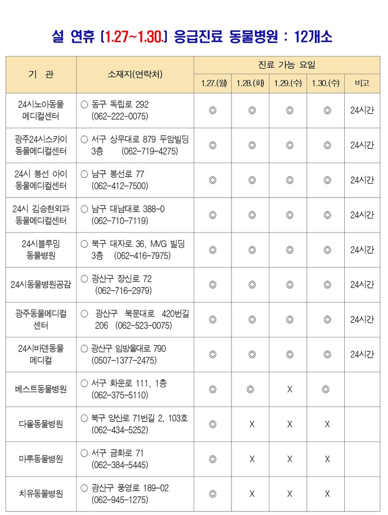 설 연휴 기간 진료하는 동물병원 정보는 120콜센터(062-120), 광주시 누리집 공지사항, 농림축산식품부 누리집에서 확인할 수 있다.