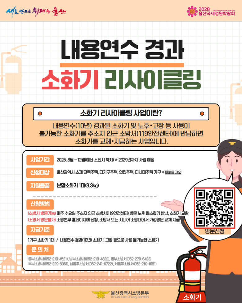 소방본부 관계자는 “소화기는 초기 화재발생 시 안전하게 대응할 수 있는 가장 기본적인 장비다”라며 “이번 사업 추진으로 노후한 소화기를 교체하고 최신 소화기를 비치함으로써 화재로부터 안전한 환경을 조성하여, 울산시민의 생명과 재산을 지킬 수 있도록 최선을 다하겠다”라고 말했다.