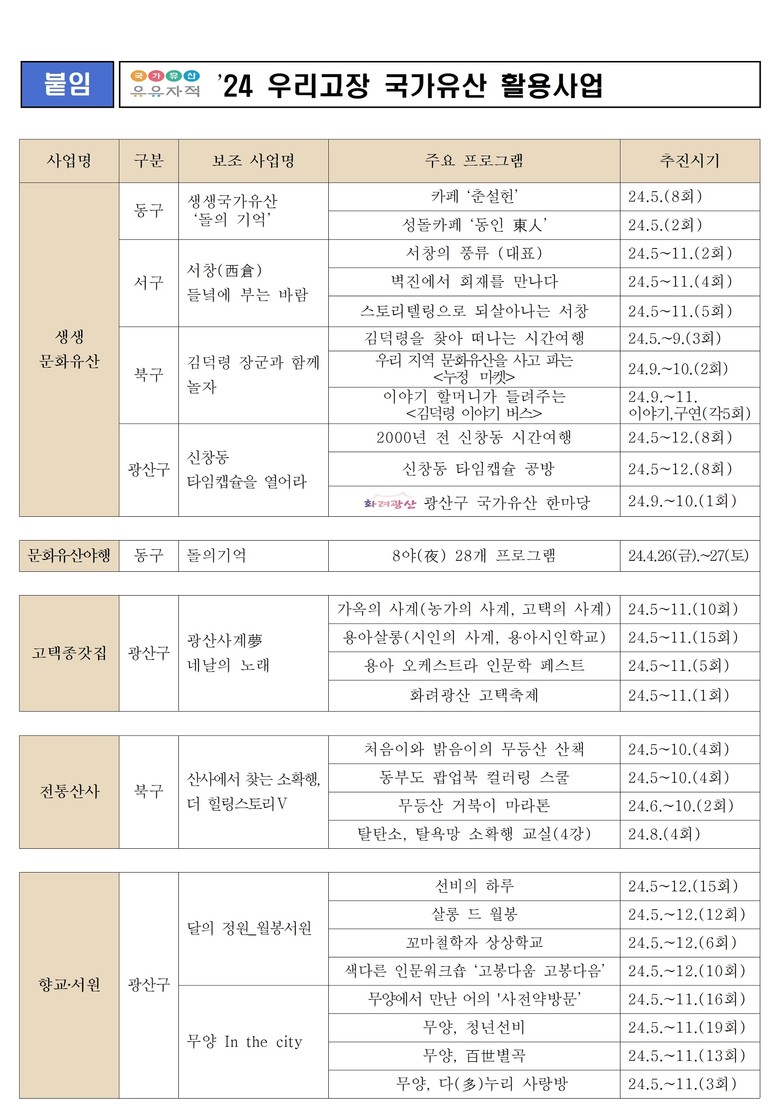 광주광역시(시장 강기정)는 국가유산청이 선정한 ‘2024년 우리고장 국가유산 활용사업’으로 ▲돌의 기억 ▲서창(西倉) 들녘에 부는 바람 ▲김덕령 장군과 함께 놀자 ▲신창동 타임캡슐을 열어라 ▲광산 사계 몽(夢) ▲산사에서 찾는 소확행, 더 힐링스토리 ▲달의 정원, 월봉서원 ▲무양 인 더 시티 등 총 9개 사업이 선정돼 다양한 프로그램을 선보이고 있다.