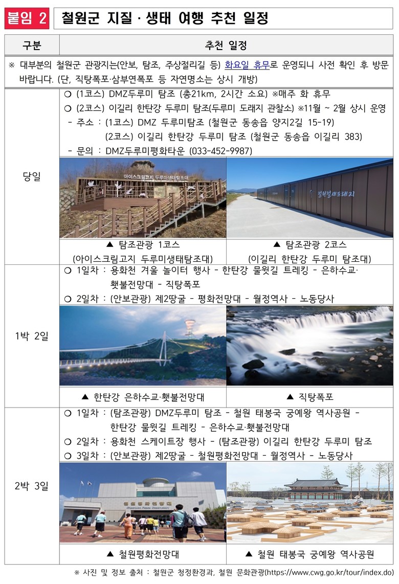 또한 인근에는 한탄강 세계지질공원의 현무암 주상절리와 협곡을가까이에서 체험할 수 있는 ‘한탄강 물윗길 트레킹’, 은하수교·횃불전망대, 직탕폭포 등 다양한 지질·생태 명소가 위치해 연계 관광이 가능하다.
