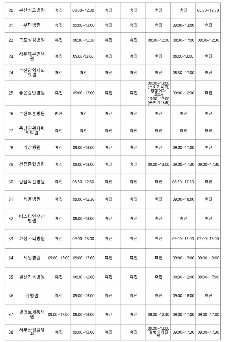 그 외 ▲대동병원 ▲비에이치에스(BHS)한서병원 ▲온종합병원 ▲좋은삼선병원 ▲광혜병원 ▲구포성심병원 ▲기장병원 ▲메리놀병원 ▲삼육부산병원 ▲좋은문화병원 ▲해동병원 ▲영도병원 ▲센텀종합병원 등도 연휴 중 선별적으로 외래진료를 진행한다.